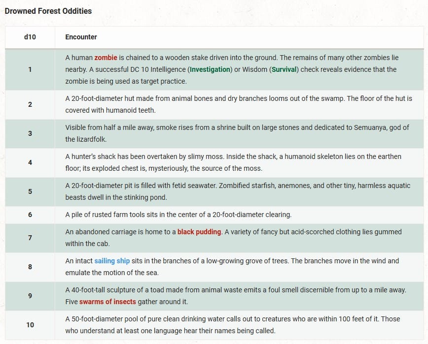 I turned to Chapter 1: Saltmarsh Region, specifically the Drowned Forest Oddities table, which offered two intriguing options: