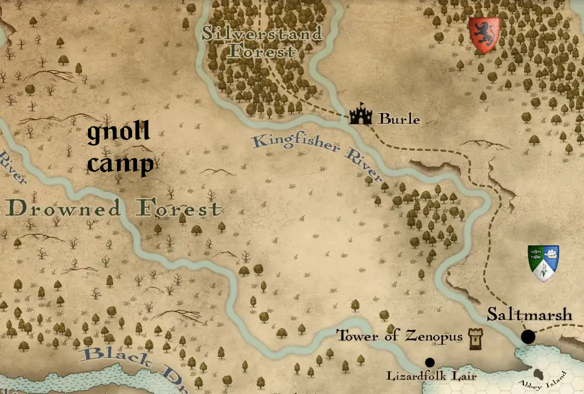This lore sparked my plot. The Drowned Forest and Dunwater River border the Hool Marsh and run parallel to the Kingfisher River. It makes sense for gnolls to have a camp near Dunwater and raid travelers on the road to the Burle, as well as fishermen on the Kingfisher.
