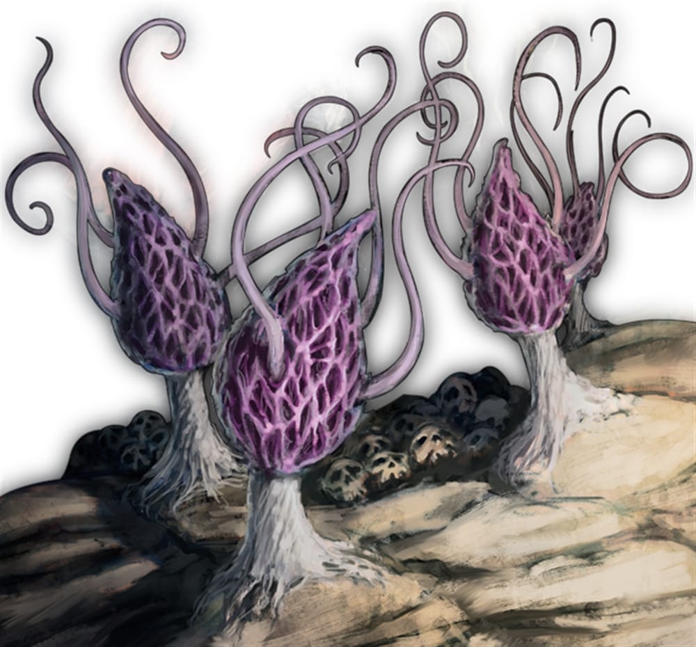 “This purplish mushroom uses root-like feelers to creep across cavern floors. The stalks lash out at prey, rotting flesh with the slightest touch. Creatures killed by violet fungi rapidly decompose, and a new fungus sprouts from the corpse in 2d6 days.”