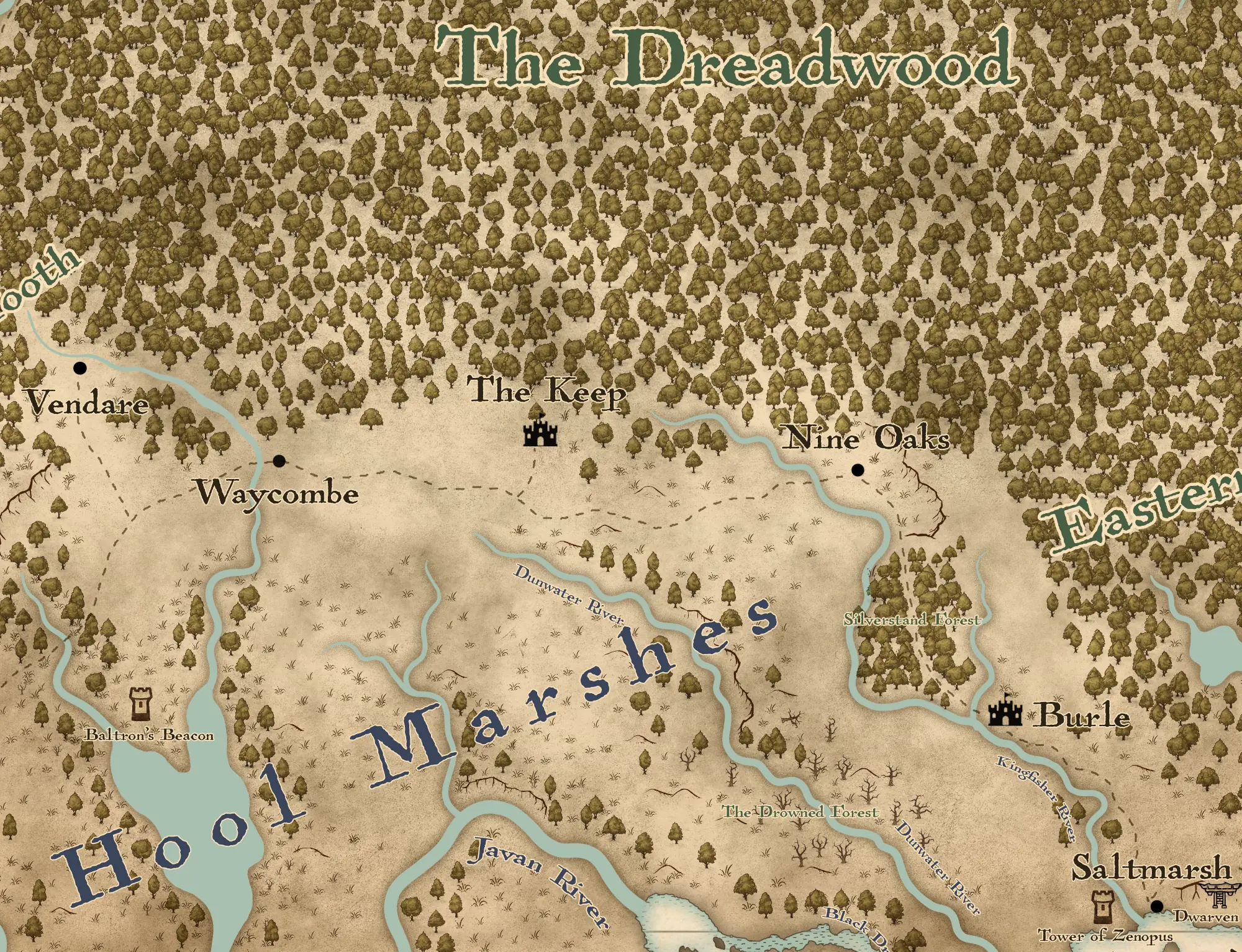 - The old road across the Dreadwood’s southern edge is a natural borderland: very dangerous Dreadwood to the north and the Hool Marshes to the south.